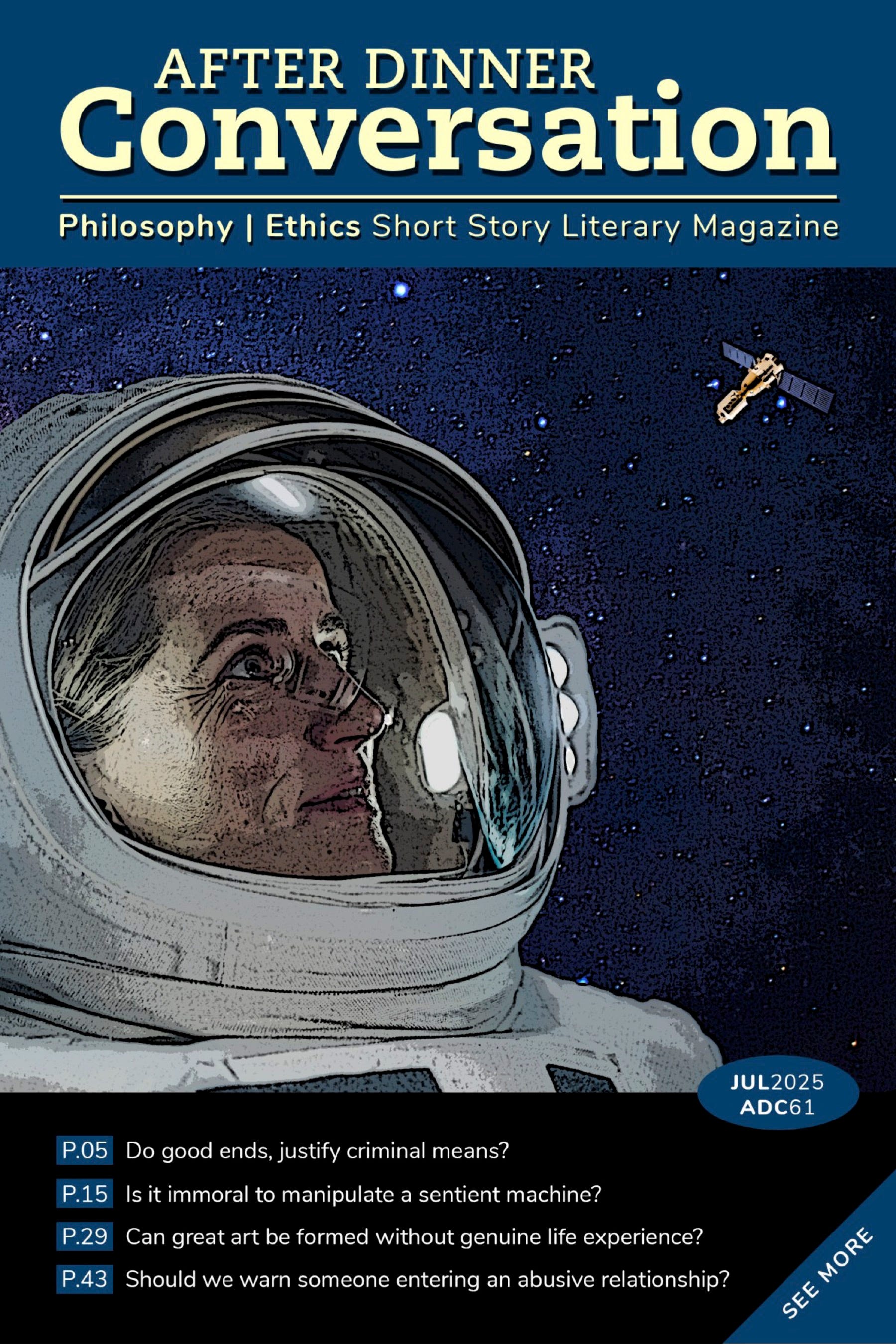 After Dinner Conversation is a monthly literary magazine publishing short fiction. Each issue features both established writers and up-and-coming authors who contribute fascinating philosophical insights on controversial topics like marriage equality, assisted suicide, the meaning of death, animal rights, and defining your "purpose."